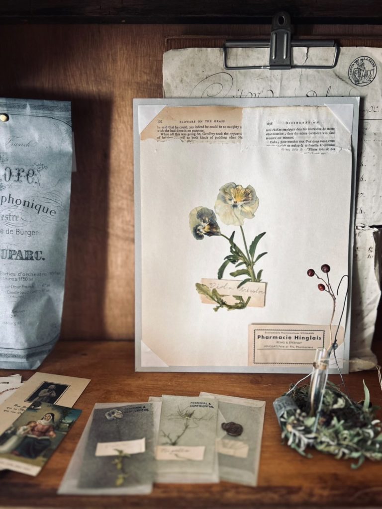 ビオラやニグラなどの押し花を古い紙に重ね、静かな冬を閉じ込めた標本のような押し花をつくります。
